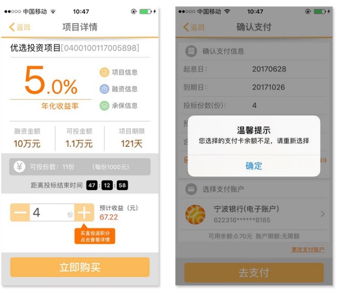 以寧波銀行直銷銀行為例,當你想購買 4000 元的直投項目的時候,點擊「立即購買」按鈕,進入「確認支付頁面」,點擊「去支付」按鈕,這時候彈出一個對話框,告訴你賬戶余額不足。具體多少余額也沒有說清楚,你立馬去「我的賬戶」里看了余額再返回購買,這時發(fā)現(xiàn)項目都被人搶光了,瞬間奔潰。