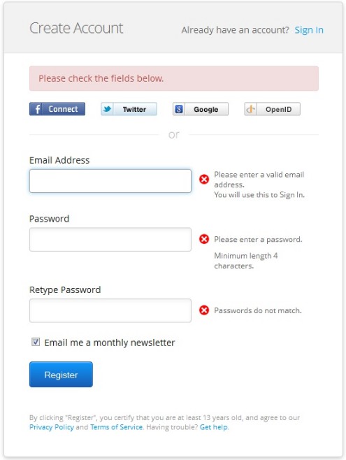 現(xiàn)在還有很多設(shè)計師開始將錯誤提示做成文字標簽形式,將其和控件放在一起。這樣子用戶就可以很容易的讀取錯誤信息,一眼就能看出來哪里出錯了,不用根據(jù)提示的控件名稱去尋找出錯的位置,因為錯誤提示就在發(fā)生錯誤控件的旁邊。此外還很容易改正,因為用戶不用再跳轉(zhuǎn)頁面或去記那些冗長的錯誤信息。