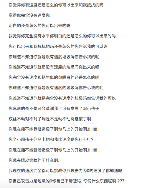 就拿扣字來說,其中的秘訣就是利用網絡的延遲,把事先打好的文字在聯(lián)網的那一刻全部發(fā)送出去,達到瞬間百字的效果,短句多對話框給人以氣勢之感。