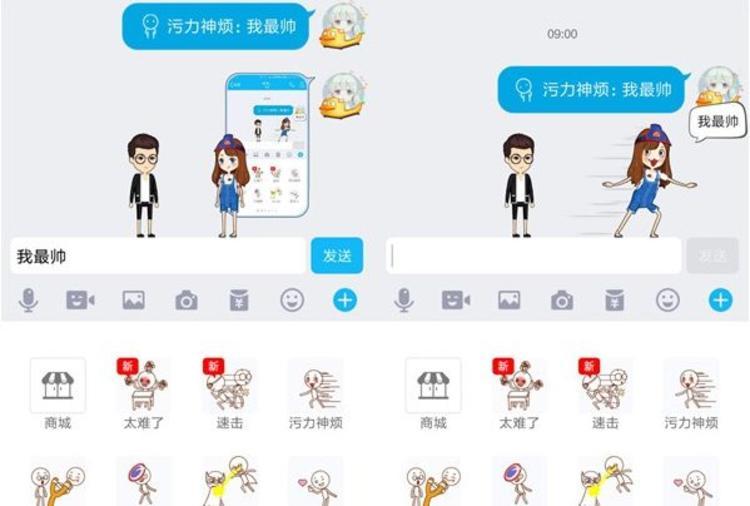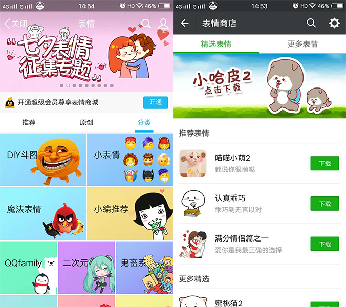 (QQ 表情和微信表情對比,左邊是 QQ 的表情商店,右邊是微信表情商店)