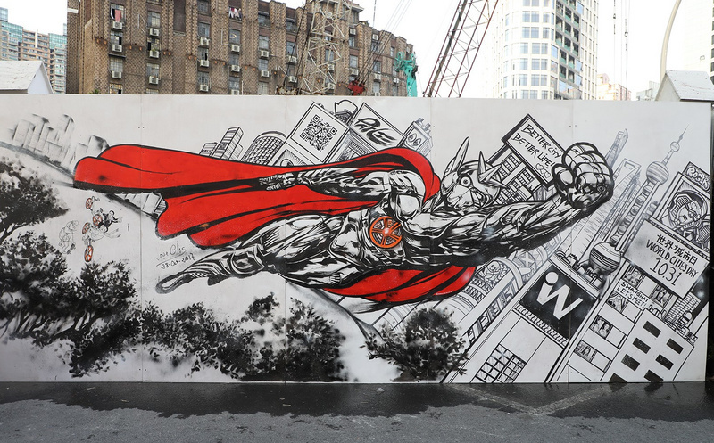 10月28日,位于南京西路石門一路口工地圍擋,國際知名漫畫藝術家Pat Lee以2017 “世界城市日”為背景,創(chuàng)作了摩拜單車主題藝術涂鴉作品。