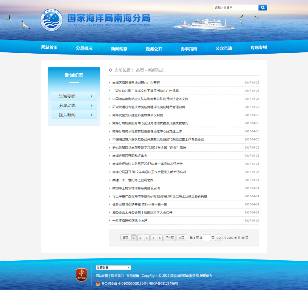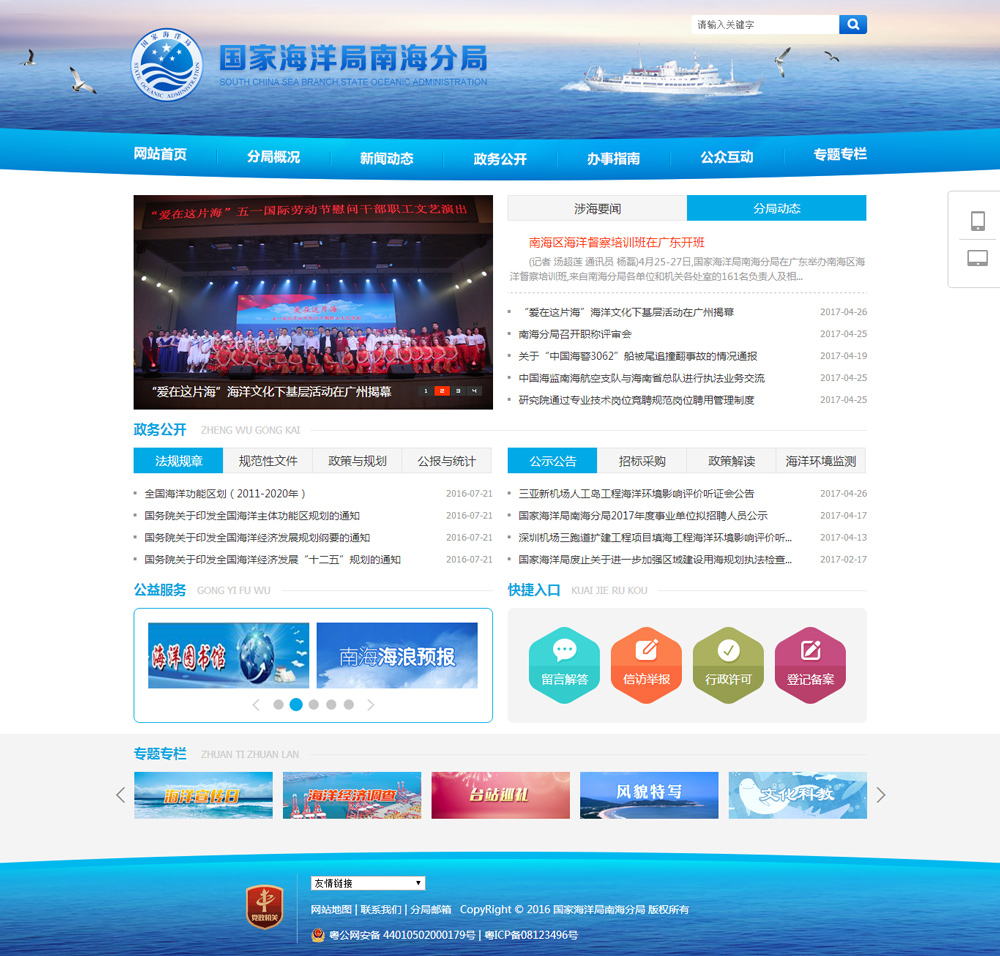 國家海洋南海分局成立于1965年3月18日,是國家海洋局設(shè)在廣州的南海區(qū)海洋行政管理機(jī)構(gòu)。南海海區(qū)現(xiàn)設(shè)有中國海監(jiān)南??傟?。分局擁有海洋水文、化學(xué)、地質(zhì)、氣象、生物、遙測浮標(biāo)、海洋計量檢定、海洋環(huán)境質(zhì)量評價、海洋信息服務(wù)等專業(yè)隊伍及先進(jìn)的儀器設(shè)備,擁有遍布兩廣沿海的觀測站網(wǎng)和遙測海洋環(huán)境數(shù)據(jù)浮標(biāo)網(wǎng)。有裝備比較先進(jìn)的“中國海監(jiān)”船、遠(yuǎn)洋考察船。